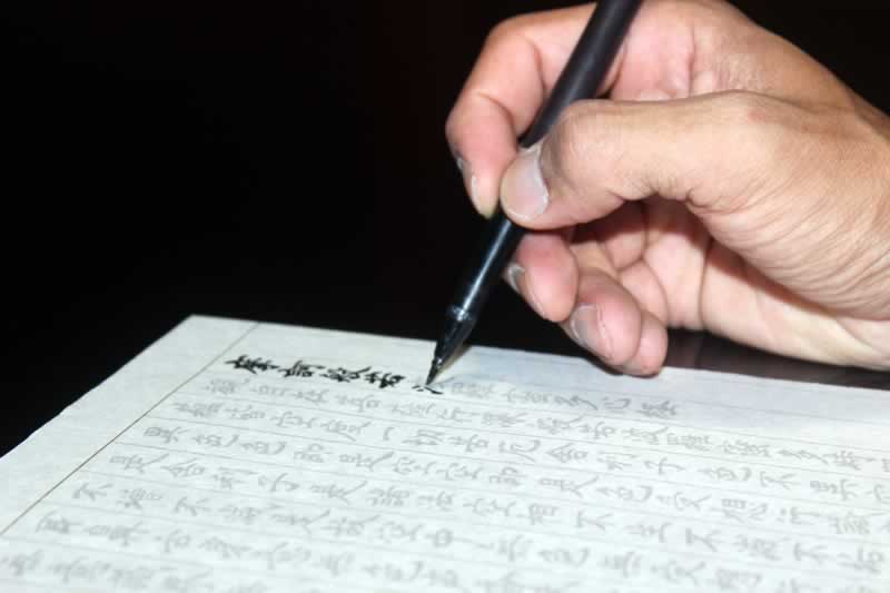 ➀書院にて写経筆でなぞる式の写経用紙を準備しております。心静かにお経を写して下さい。 |