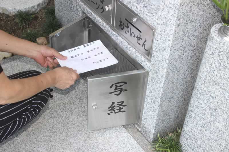 ③数珠掛け地蔵尊前で納経お地蔵さんの前に箱があり、最初に書いて頂いた写経を納めていただきます。 |