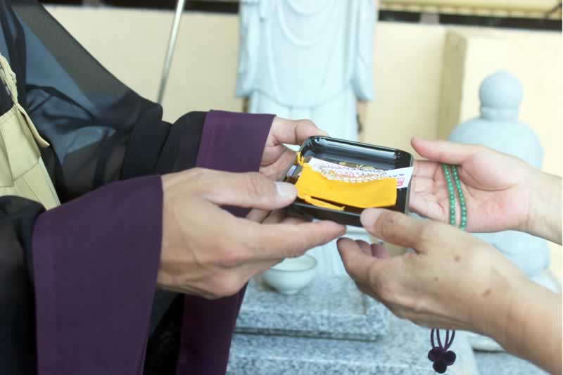 ⑤数珠授与水晶のお数珠をお渡しします。持ち帰れない場合は、お地蔵さまの左手にお掛け下さい。 |
